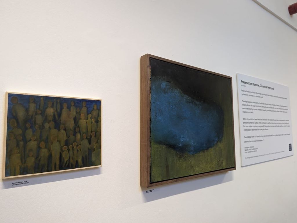 ” Drawing inspiration from the local landscape and social history of the West of Ireland, the paintings explore the impacts of both the Great Irish Famine and the climate and biodiversity crises. Past and present, these calamitous events are linked by common threads of inequality, vulnerability, destructive policies, extreme weather events, migration and death. Within the exhibition, these threads are interwoven with symbols of ancient bogs, under pressure from traditional practices such as turf-cutting, which contributes to significant greenhouse gas emissions and loss of biodiversity. But these unique ecosystems are gradually being restored and preserved through rewetting, which promotes the capture and storage of carbon, locking it down for millennia. The exhibition holds out hope of a more just and sustainable future if positive steps are taken to protect vulnerable communities and preserve ecosystems.”.